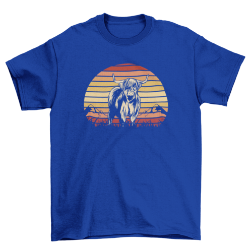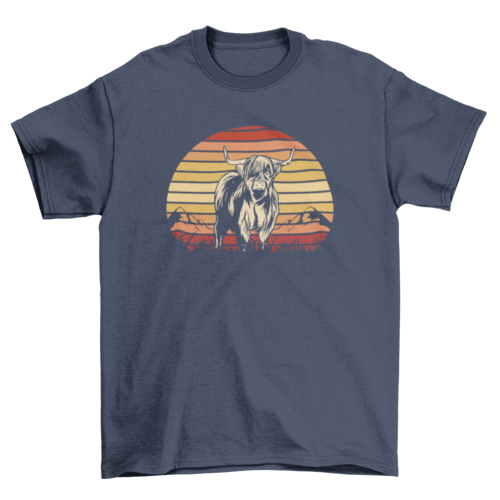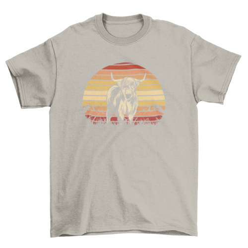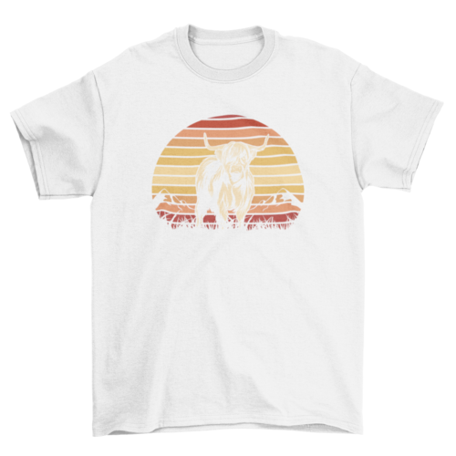 Great t-shirt design featuring a highland cattle with a retro sunset behind.
