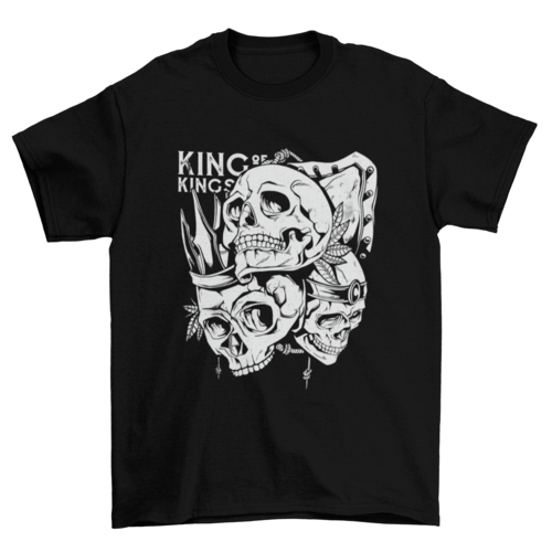 Epic t-shirt design that features three skulls with crowns and a shield. It includes the quote "King of kings".